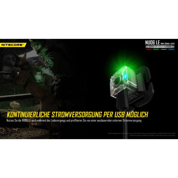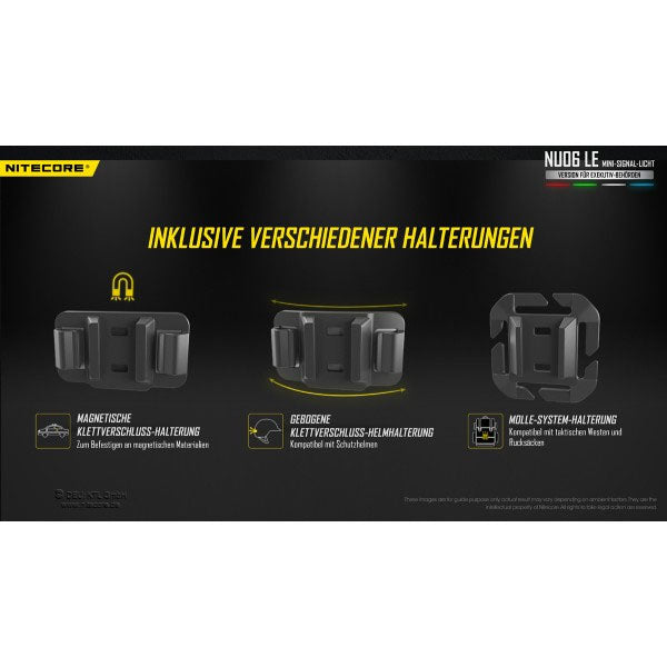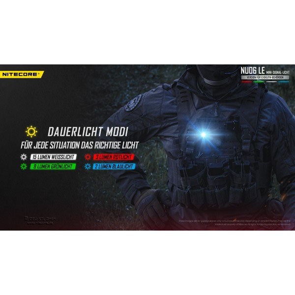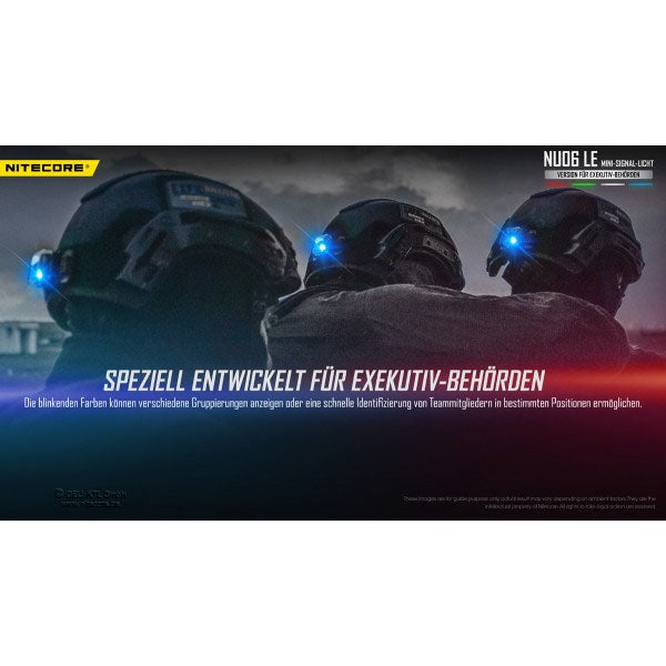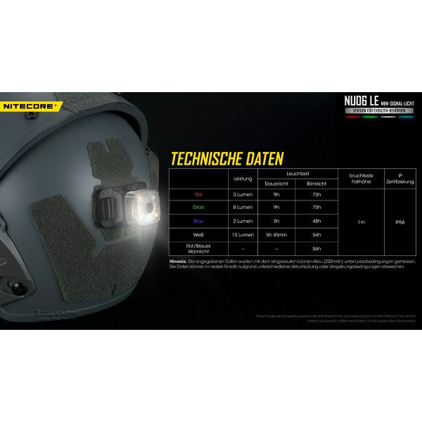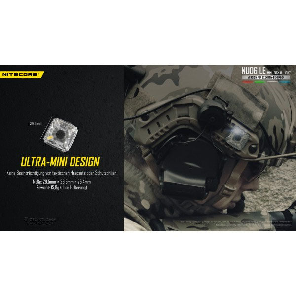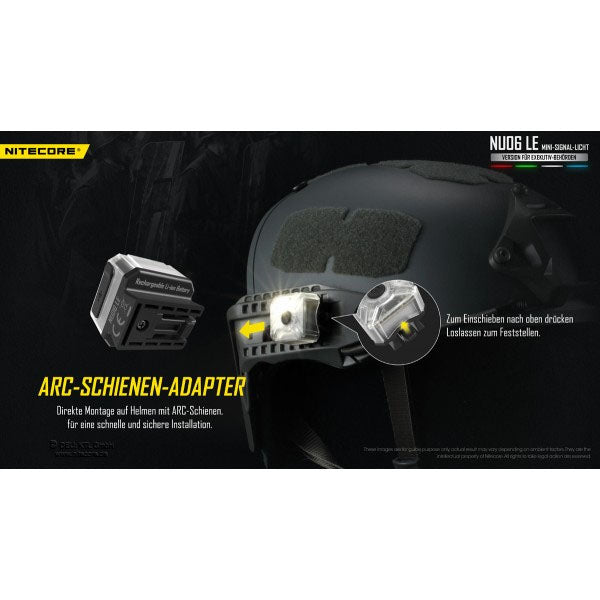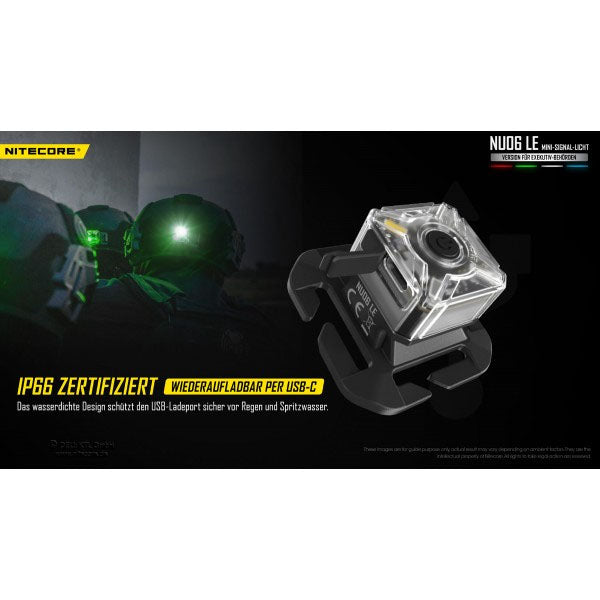 La Nitecore NU06LE est une lampe de signalisation petite et compacte dont la batterie Li-Ion intégrée peut être chargée via un port USB-C. Le NU06LE est livré avec trois supports : un magnétique (avec Velcro), un incurvé pour le casque (avec Velcro) et un support pour la fixation au système MOLLE. Le NU06LE est équipé d'un adaptateur pour le rail ARC et peut ainsi être fixé au casque sans support supplémentaire. Le Nitecore NU06LE dispose de 4 LED colorées. avec 9 modes différents.