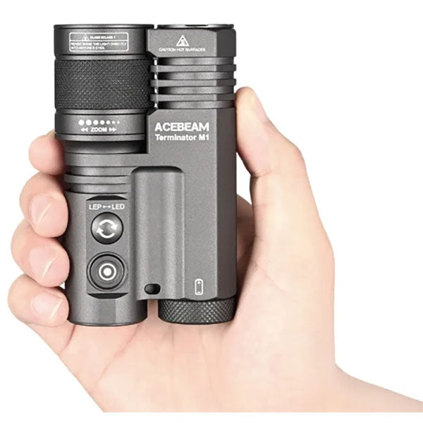 TERMINATOR M1 DUAL HEAD è la prima lampada di ACEBEAM che combina le più recenti tecnologie LEP e LED. Il modulo LEP crea un fascio luminoso focalizzabile fino a 1600 metri! Passa facilmente da Spotlight a Floodlight con un tasto di scelta rapida. TERMINATOR M1 DUAL HEAD è alimentato da una potente batteria ricaricabile agli ioni di litio USB-C 21700. La sostituzione perfetta per un proiettore, un faretto, un segnale o qualsiasi altro tipo di illuminazione.