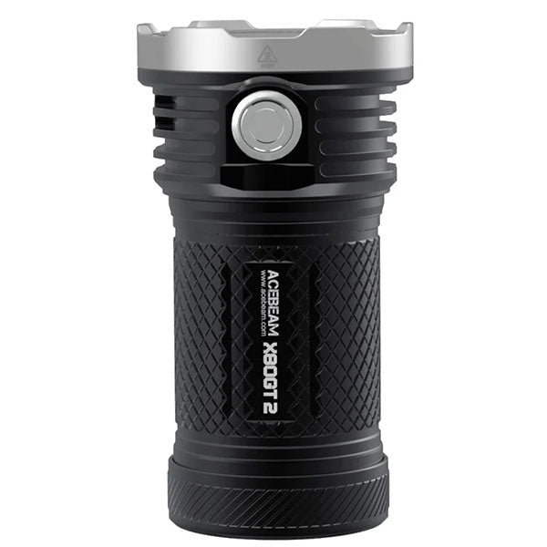 AceBeam offre la nuova torcia LED X80-GT2 con 18 pezzi di CREE XHP50.3 HI 6500k. Produce un massimo di 34.000 lumen e ha una portata fino a 498 metri. L'X80-GT2 è alimentato da 4 batterie agli ioni di litio 18650, incluse nella fornitura. La lampada ha un design molto compatto e si accende tramite un unico interruttore sotto la testa della lampada. Questo interruttore laterale è anche responsabile dei programmi luce. L'AceBeam X80GT2 è dotato della più recente tecnologia di driver ed è impermeabile fino a 30 metri.