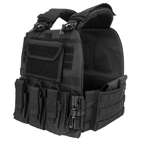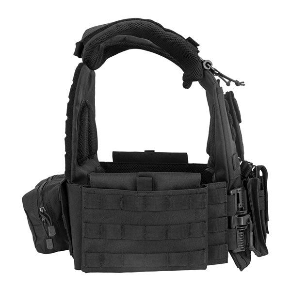 Le due parti laterali di questo portatarga con tasche sono elastiche, di dimensioni adeguate e possono essere utilizzate per piastre laterali balistiche. Anche le due cinghie sono regolabili. Il portatarga contiene due piastre rigide di protezione balistica (non incluse) nella dimensione standard di 25 cm x 30 cm ed è inoltre dotato di pratiche superfici in velcro nella parte anteriore e posteriore. Il PROTEKTO QUICK RELEASE è inoltre completamente equipaggiato con 3 tasche per caricatori, una custodia amministrativa e una custodia medica. Tutte le borse sono compatibili con Molle.