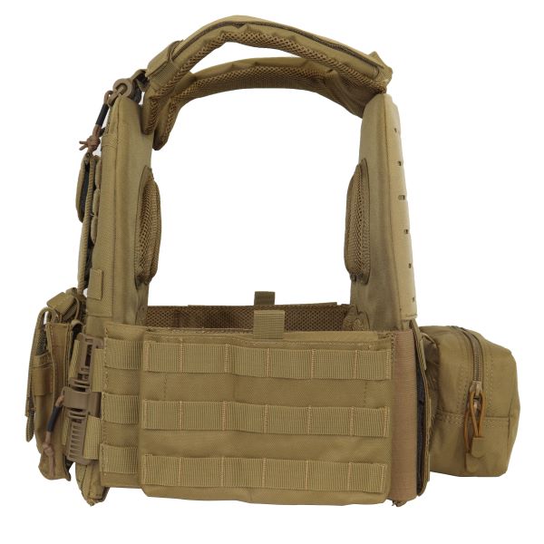 Le due parti laterali di questo portatarga con tasche sono elastiche, di dimensioni adeguate e possono essere utilizzate per piastre laterali balistiche. Anche le due cinghie sono regolabili. Il portatarga contiene due piastre rigide di protezione balistica (non incluse) nella dimensione standard di 25 cm x 30 cm ed è inoltre dotato di pratiche superfici in velcro nella parte anteriore e posteriore. Il PROTEKTO QUICK RELEASE è inoltre completamente equipaggiato con 3 tasche per caricatori, una custodia amministrativa e una custodia medica. Tutte le borse sono compatibili con Molle.