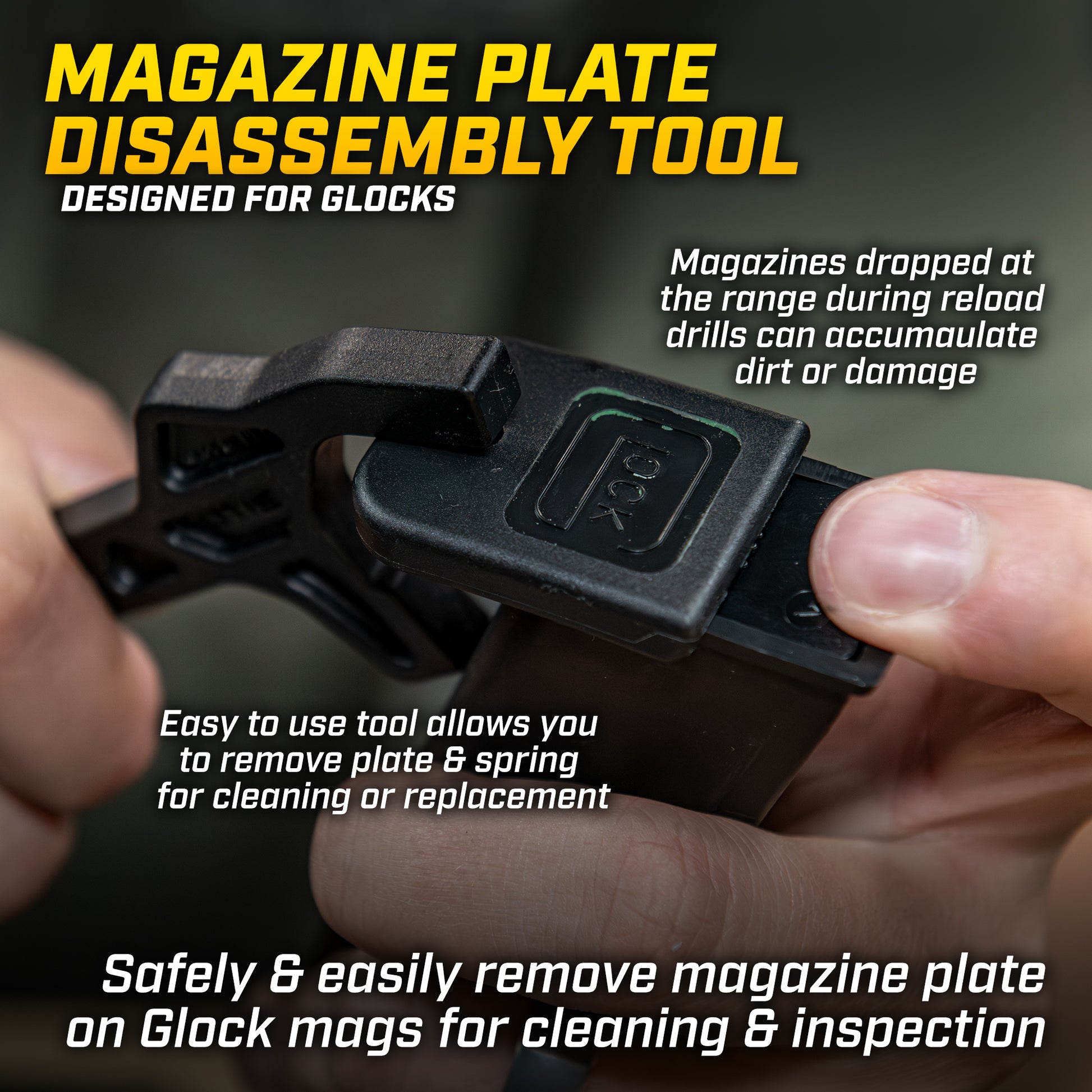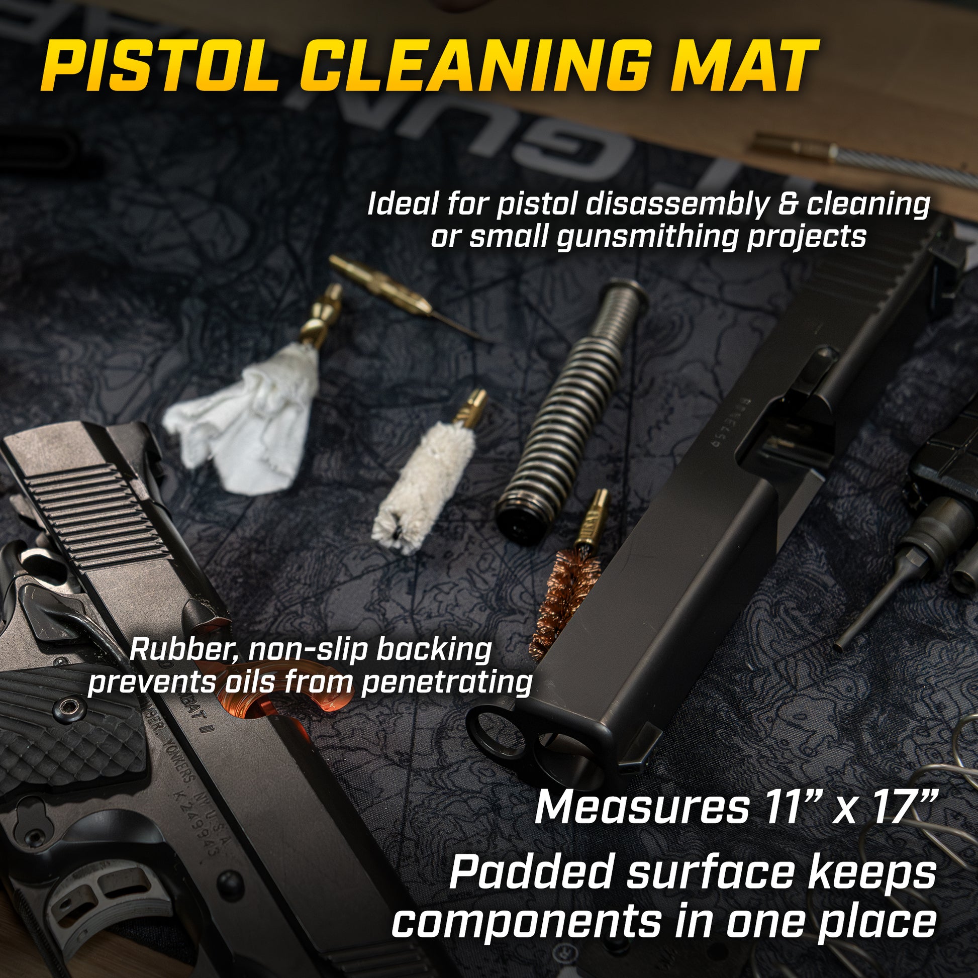 Per una pulizia rapida in movimento, sono disponibili quattro cordini di strappo per calibri .22cal, 9mm/.38cal/.380/.357, 10mm/.40cal e .45cal. Attrezzi specializzati come raschietti, spazzole AP, uno strumento per la rimozione del caricatore Glock e il versatile strumento per pistole 8 in 1 portano la tua manutenzione a un livello superiore. Grazie al tappetino per la pulizia da 28x43 cm incluso, le vostre pistole saranno sempre ben protette.