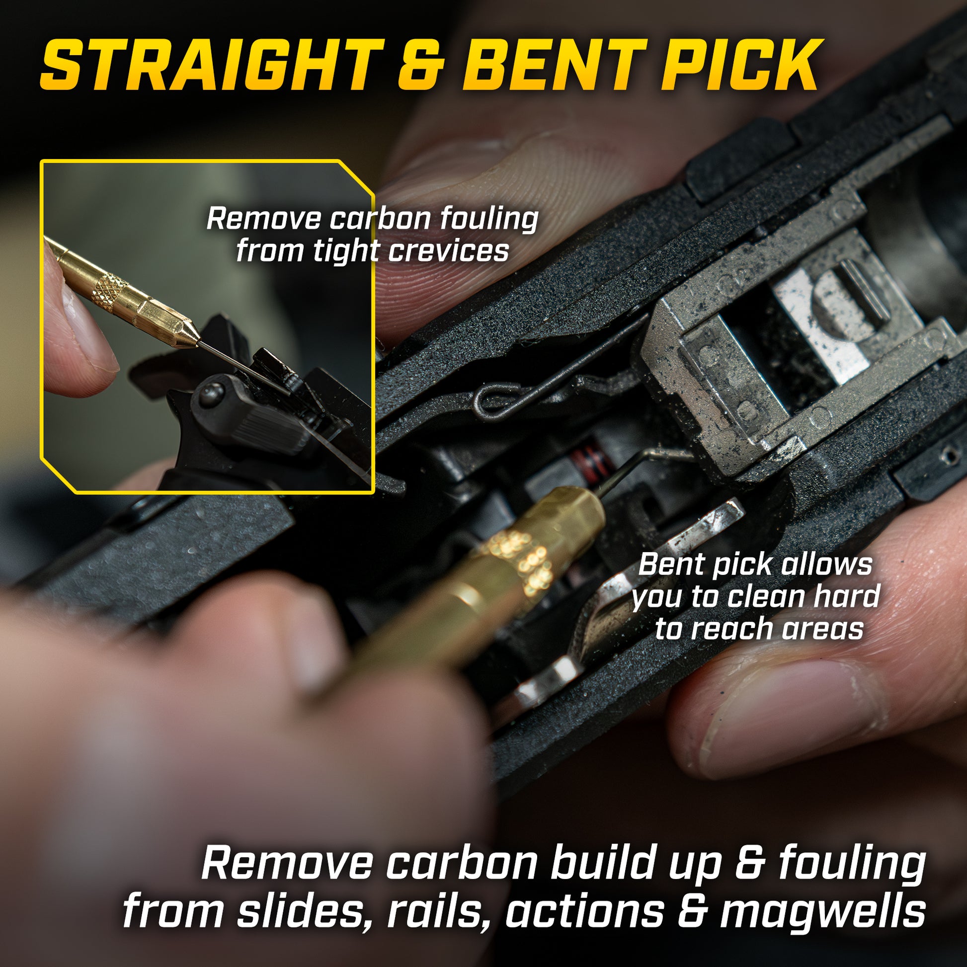 - Pulisce e mantiene le pistole di calibro .22, 9mm, .38/.380, .357, 10mm, .40, .44 e .45