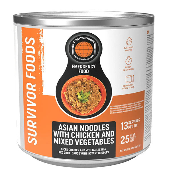 La gamma di lattine Survivor Foods di EXPEDITION FOODS è ideale per le emergenze e ti offre tranquillità grazie a pasti nutrienti, sani e gustosi. Che si tratti di calamità naturali (terremoti, uragani, tsunami), di interruzioni di corrente prolungate o di lunghi viaggi in montagna, nel deserto o ai tropici, sono leggeri, poco ingombranti e durano 25 anni. Essendo pasti liofilizzati, sono facili da preparare: usa tutta o parte della lattina, aggiungi acqua, lascia reidratare e in pochi minuti avrai pronto un pasto delizioso e nutriente per un massimo di 13 persone.
