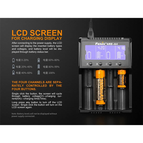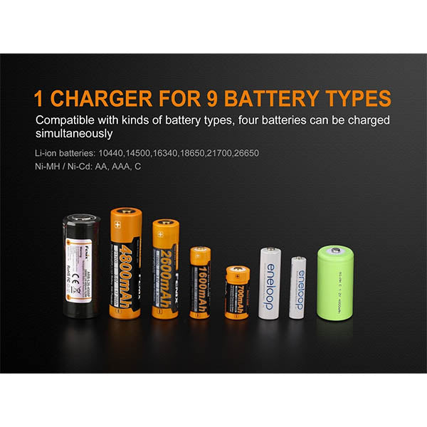 Contenuto della confezione; Caricabatterie Fenix ARE-CA4 (SENZA BATTERIE), cavo di alimentazione 230V, manuale utente