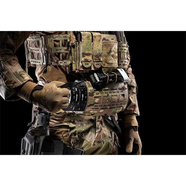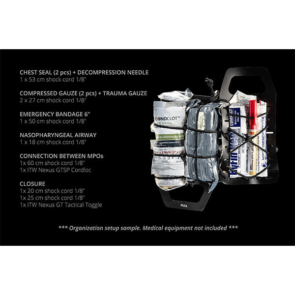 La struttura tubolare di ORTHOS MED POUCH realizzata con elastici MIL-W-5664 da 4″ rimane fissata all'attrezzatura di supporto, mentre il contenuto medico, fissato a due organizer multiuso 4x3, può essere rimosso con una mano da entrambi i lati. Il fissaggio del contenuto può essere regolato a piacere utilizzando due sistemi elastici laterali guidati attraverso la borsa e fissati tramite ITW Nexus Cordloc. ORTHOS MED POUCH ha uno scomparto integrato per guanti in nitrile e uno scomparto speciale per il laccio emostatico con marcatura TQ incisa al laser. La marcatura medica tagliata al laser consente all'utente di scegliere il colore a seconda delle circostanze e di passare dall'uso ad alta visibilità a IR o riflettente. L'alto grado di design modulare consente all'utente di personalizzare il contenuto della borsa, il posizionamento degli oggetti e il metodo di conservazione.