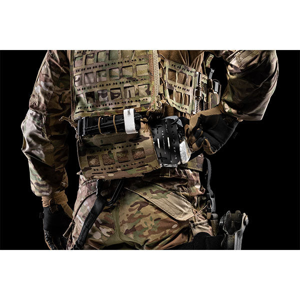 - Striscia in Velcro® a un giro per il fissaggio alla cintura da combattimento a ore 6;
