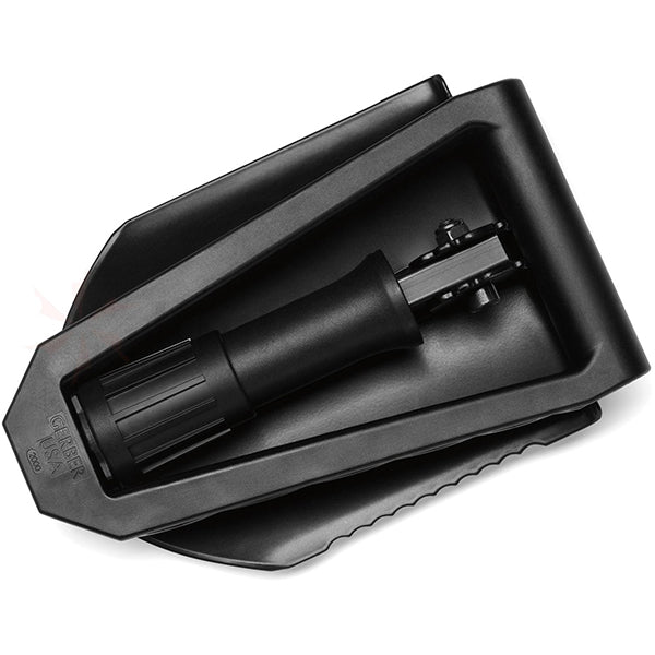 La vanga pieghevole Gerber E-Tool è dotata di un manico in nylon rinforzato con fibra di vetro, una lama in acciaio al boro-carbonio verniciata a polvere e un albero in alluminio 7075 anodizzato. Pesa solo 1134 grammi.