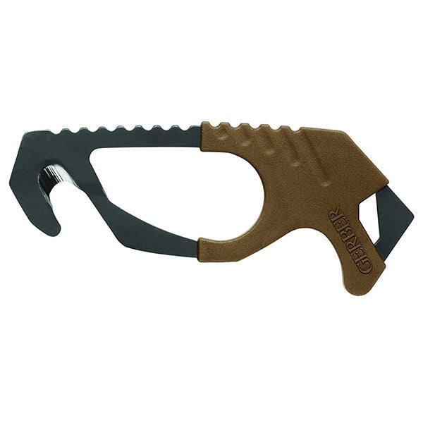 Il tagliacinghie Gerber taglia senza sforzo cinture di sicurezza o altre cinghie di nylon. Fissato all'attrezzatura e grazie al fissaggio capovolto, il tagliacinghie Gerber è subito a portata di mano quando necessario. La forma è progettata in modo che il tagliacinture possa essere utilizzato anche con i guanti. Realizzato da un unico pezzo di acciaio 420HC e rifinito con una finitura opaca. È inclusa una robusta guaina con clip.