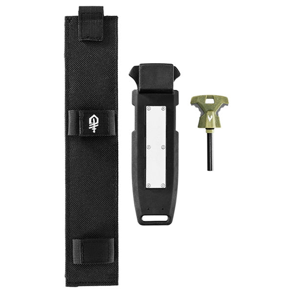 Il coltello Gerber Ultimate Survival ha ampie caratteristiche basate sulle esperienze dell'alpinista britannico ed esperto di sopravvivenza Edward Grylls. La lama seghettata è realizzata in acciaio inossidabile Cr17Mo con finitura sabbiata con perle di vetro. L'impugnatura dotata di materiale TacHide antiscivolo ha all'estremità una superficie a martello in acciaio inossidabile. I fori multipli del manico consentono di fissare e fissare il coltello in vari modi. Accessori molto utili sono inclusi sotto forma di un accendifuoco, un affilatore di diamanti e un fischietto di segnalazione. È inclusa una guaina realizzata con una combinazione di nylon/plastica che può essere fissata in modo variabile per ospitare coltelli e accessori.