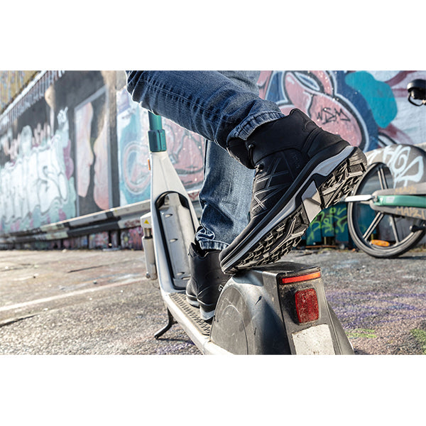 Resistenza allo scivolamento estremamente elevata e bassa usura grazie alla gomma speciale e alla struttura innovativa della suola. Le lamelle e gli elementi speciali della suola garantiscono una presa ottimale, nonché un'elevata agilità e un appoggio stabile su superfici lisce e bagnate. Una zeppa ammortizzante leggera in PU assicura eccellenti caratteristiche di corsa. Ottimo isolamento dal freddo, resistente al carburante e non sfarinante.