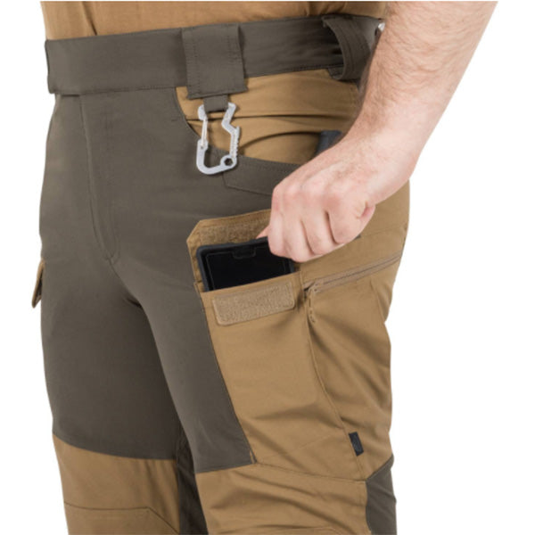 Gli HYBRID OUTBACK PANTS sono moderni pantaloni ibridi da esterno con la massima libertà di movimento, ideali per lunghe escursioni in montagna e campeggio. I pantaloni sono comodi e resistenti. Ci sono due tasche frontali classiche con bordi rinforzati per clip per coltello/torcia elettrica, due tasche sulle cosce con chiusura in velcro e due tasche cargo con cerniera. L'area del ginocchio è compatibile con gli inserti aggiuntivi a basso profilo che possono essere ordinati.