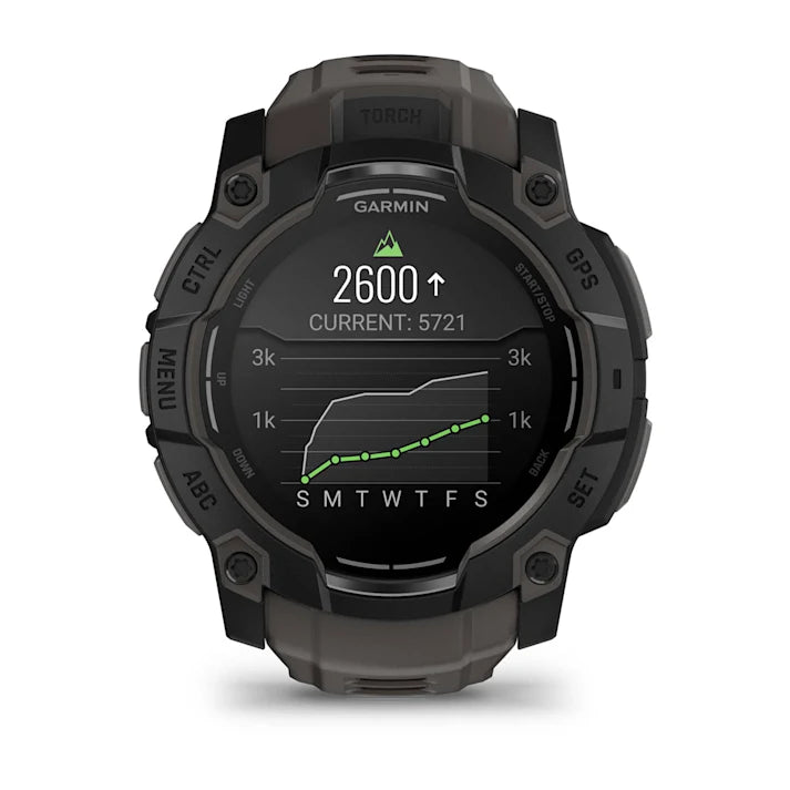 Grazie alla cornice rinforzata in metallo e al vetro resistente del display, Instinct 3 è pronto ad affrontare qualsiasi sfida. E grazie alla torcia LED integrata, che offre diversi livelli di luminosità e luce rossa, puoi sempre avere una visione d'insieme anche al buio.