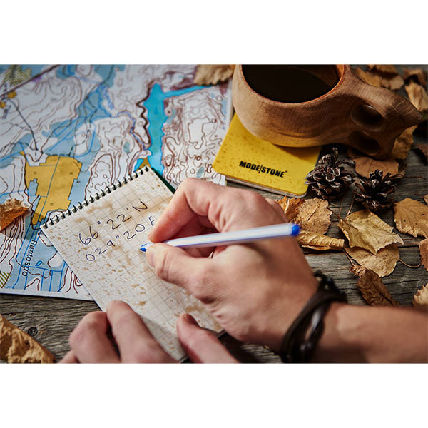 I taccuini impermeabili MODESTONE sono il risultato di molti anni di sviluppo del prodotto. L'idea dei taccuini impermeabili è nata quando l'inventore Kalle Kinnunen prestava servizio nelle forze armate finlandesi e i suoi appunti importanti della scuola per sottufficiali furono distrutti dall'acqua. La sfida più grande è stata trovare un materiale sostitutivo perfetto per la carta. Dopo approfondite ricerche e innumerevoli test, è stata finalmente sviluppata la carta di pietra MODESTONE. È resistente all'acqua e ai grassi, quasi indistruttibile e non viene mangiato dagli insetti. Allo stesso tempo, è una scelta rispettosa dell'ambiente poiché la carta MODESTONE è composta per l'80% da CaCo3 (carbonato di calcio) e per il 20% da HDPE (polietilene). La carta di pietra impermeabile MODESTONE ha un'altra caratteristica sorprendente: puoi persino scrivere i tuoi appunti su di essa con una chiave o qualsiasi altro oggetto appuntito.