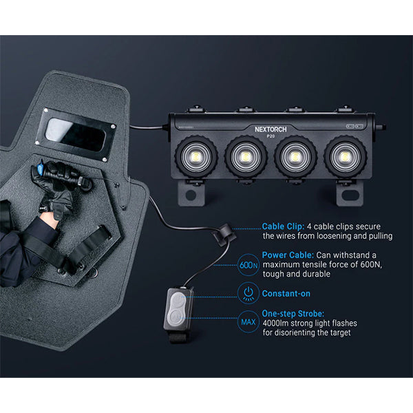 Il P20 4K offre molteplici modalità di illuminazione e un'interfaccia intuitiva per un facile utilizzo, consentendo agli utenti di regolare la luminosità in base alle proprie esigenze specifiche. Il fascio luminoso è progettato per raggiungere una distanza significativa e migliorare la visibilità in aree con scarsa illuminazione o a lunga distanza. La piastra posteriore regolabile ad arco si adatta a vari schermi per un'installazione più sicura e stabile. Grazie al doppio interruttore remoto, puoi passare rapidamente alla luce continua o allo stroboscopio con una semplice operazione.