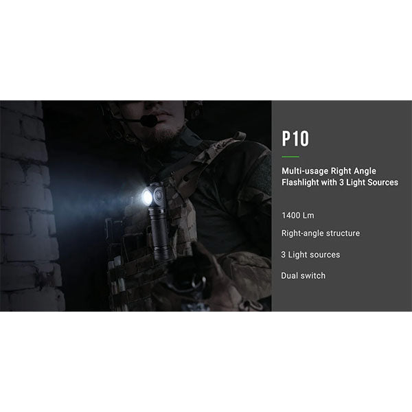 La torcia tattica angolare P10 di NEXTORCH è una lampada a LED robusta e completamente impermeabile, dotata di una tecnologia potente. L'alloggiamento della lampada LED angolare P10 è realizzato in alluminio aeronautico praticamente indistruttibile.