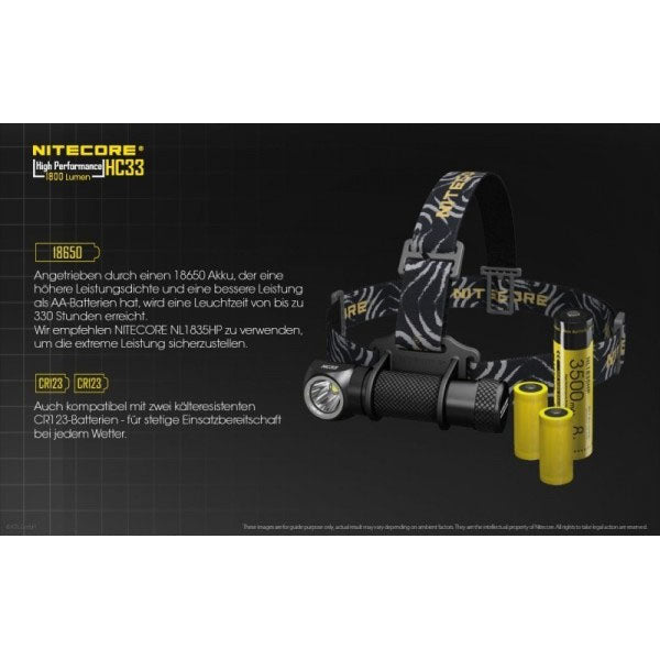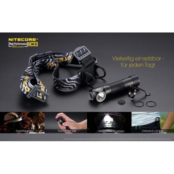 La Nitecore HC33 è una versione con prestazioni migliorate della popolare HC30. L'HC33 eroga un massimo di 1800 lumen (utilizzando la batteria NL1835HP inclusa).