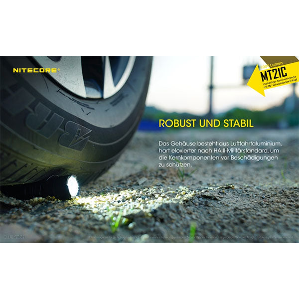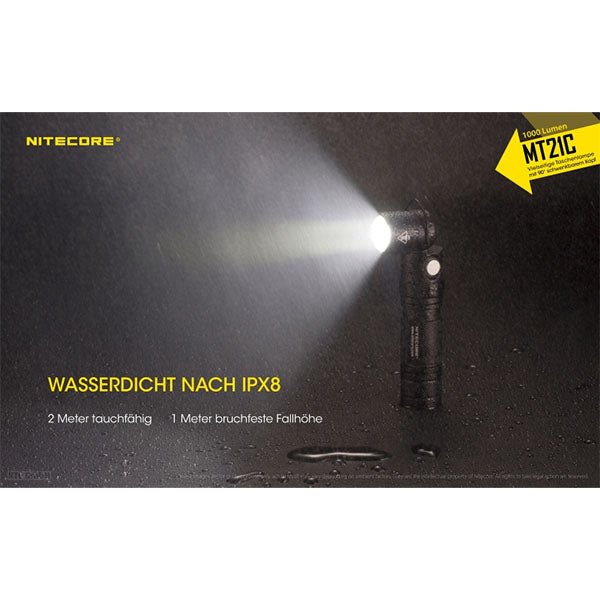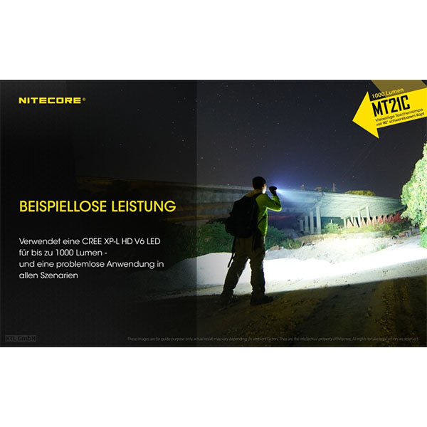 La Nitecore MT21C si caratterizza per la sua testa della lampada, che può essere ruotata di 90°, e per l'ampia gamma di possibili utilizzi ad essa associata. Il LED CREE XP-L HD V6 integrato produce un massimo di 1000 lumen. L'MT21C viene azionato dall'interruttore anteriore sulla testa della lampada. Il coperchio della batteria è magnetico, il che aumenta le possibilità di utilizzo.