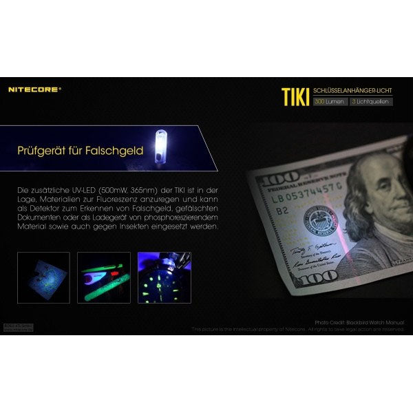 La Nitecore TIKI LE è una piccola ma luminosa torcia portachiavi, la cui batteria agli ioni di litio integrata può essere caricata tramite una porta micro USB. Il LED OSRAM P8 ha una potenza massima di 300 lumen. Oltre al LED principale, la Nitecore TIKI LE ha un LED rosso e uno blu.
