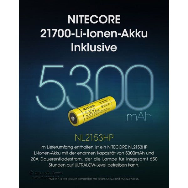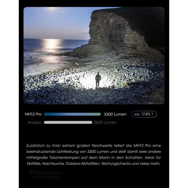 La MH12 PRO di NITECORE è la prima torcia LED dotata di LED NiteLap UHi. UHi-LED è uno sviluppo proprietario del produttore NiteLap che, come Nitecore, appartiene al gruppo Sysmax. I LED UHi presentano vantaggi decisivi rispetto ad altri produttori di LED come CREE, Luminus o Osram: maggiore potenza luminosa, intensità spot notevolmente più elevata, raggio luminoso notevolmente maggiore e durata di combustione più lunga. I dati sulle prestazioni della MH12 PRO sono impressionanti e senza rivali considerando le dimensioni della lampada: 3300 lumen di luminosità, portata del fascio luminoso di 505 metri, ricarica USB-C, batteria da 5300 mAh. La MH12 PRO si accende tramite l'interruttore posteriore, mentre i livelli di luce vengono modificati tramite l'interruttore di modalità sulla testa della lampada. Sul lato destro dell'interruttore di modalità, 4 LED verdi indicano il livello di carica della batteria, mentre 4 LED blu sul lato sinistro dell'interruttore di modalità indicano il livello di luce attivo. L'utente ha a disposizione due modalità: Modalità giornaliera e Modalità tattica. Le modalità differiscono nel numero e nella disposizione dei livelli di illuminazione e delle modalità speciali. Un sensore ottico integrato riduce immediatamente la luminosità della MH12 PRO per evitare danni alla lampada o a un oggetto (ad esempio uno zaino). La struttura migliorata della superficie del tubo della batteria garantisce una presa sicura anche quando si utilizza con le mani bagnate o con i guanti.
