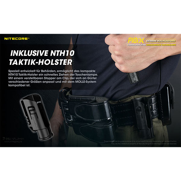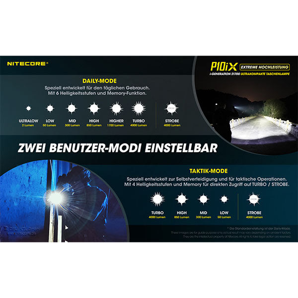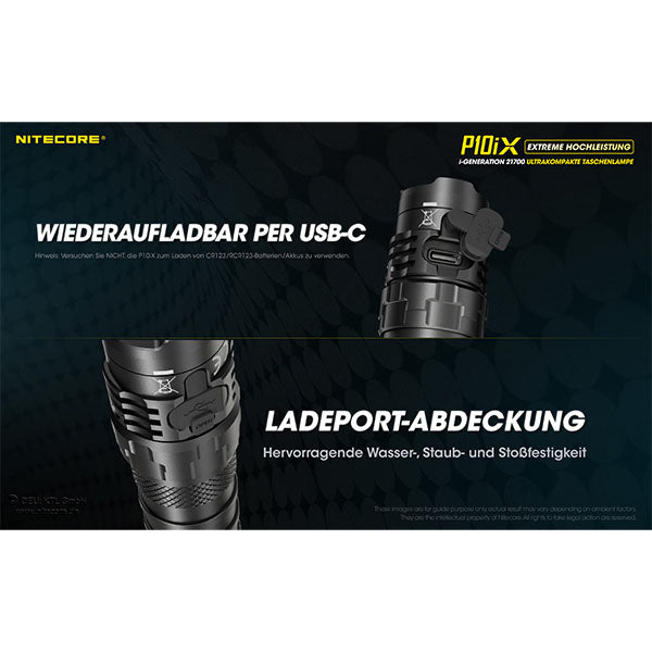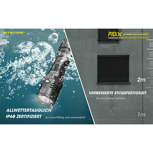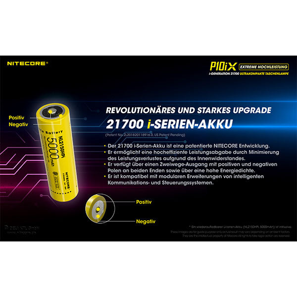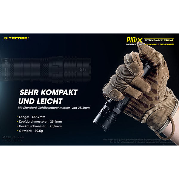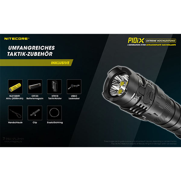 Contenuto della confezione: Nitecore P10iX, batteria agli ioni di litio 21700 tipo NL2150HPi da 5000 mAh, fondina tattica NTH10, clip, cordino, anello di tenuta di ricambio, alloggiamento per batteria, cavo di ricarica USB-C.