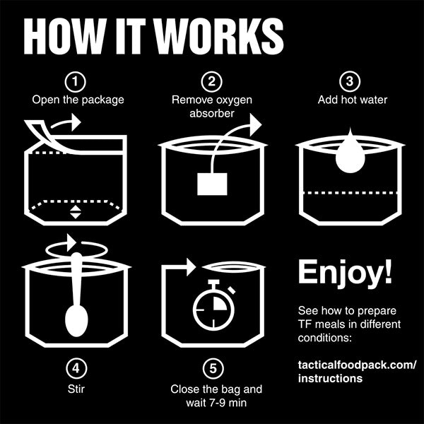 Preparazione dei piatti TACTICAL FOODPACK in 5 passaggi: