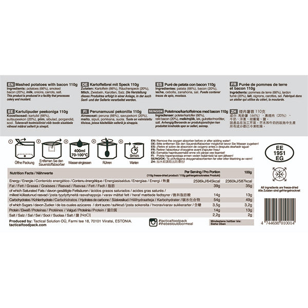 Purè di patate fatto in casa con vere patate e latte e con pancetta croccante. Il piatto ha un altissimo contenuto energetico ed è già diventato estremamente popolare in brevissimo tempo. 100% naturale, senza conservanti né additivi.