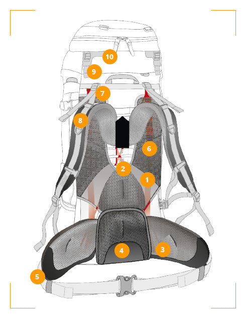 Le due barre in GRP (2) vengono condotte fuori dai canali delle barre in alluminio nella zona inferiore e conducono lateralmente (3) nelle ali dell'anca. Il dimensionamento e la disposizione di queste barre in GRP garantiscono un equilibrio ottimale tra un trasferimento efficiente del carico e la flessibilità simultanea del sistema. La cintura lombare ergonomica in tre parti è composta da un cuscinetto lombare centrale con inserto in gomma (4) per impedire lo scivolamento dello zaino e da due ali coniche per i fianchi. Sono comodamente imbottiti in più strati, rinforzati con una piastra in PE e possono essere facilmente stretti e regolati utilizzando una cinghia reindirizzata (5). L'imbottitura tecnica dello schienale (6) è concava e cucita a camera per una migliore ventilazione; Ciò garantisce una tenuta ottimale e un buon contatto con lo zaino. Le cinghie di controllo del carico (7) possono essere fissate in due posizioni diverse, consentendo una regolazione precisa. Comodi spallacci (8) con possibilità di regolazione dell'altezza (9) completano il comfort di trasporto. Il coperchio è regolabile anche in altezza (10).