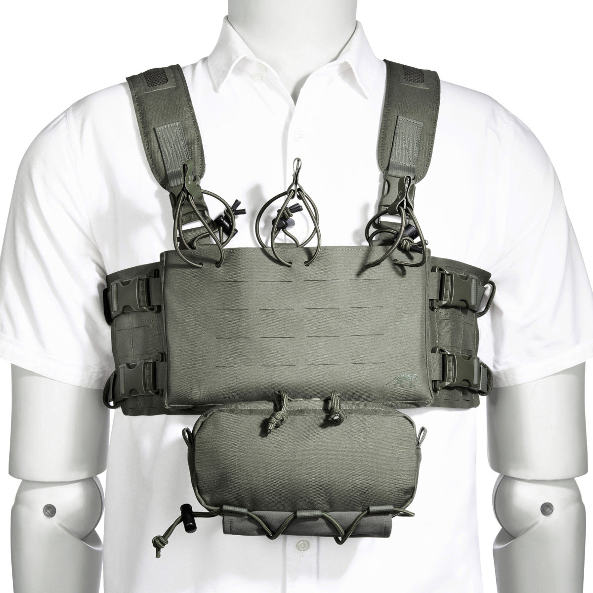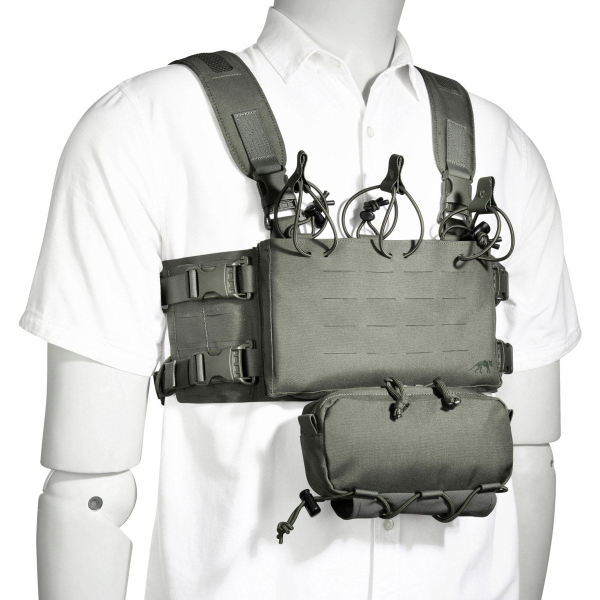 Il TT Small Combi Rig IRR della Tasmanian Tiger è dotato di un modulo caricatore rimovibile che può essere utilizzato sui portapiatti. Anche la tasca portaoggetti e le ali laterali MOLLE sono rimovibili. Sia i materiali CORDURA® che le cinghie, le chiusure a strappo e le fibbie soddisfano gli elevati standard Bundeswehr TL 8305-0278 e TL 8305-0281 per quanto riguarda l'effetto mimetico IRR (IRR 650 – 1250nm / 10 – 42%).