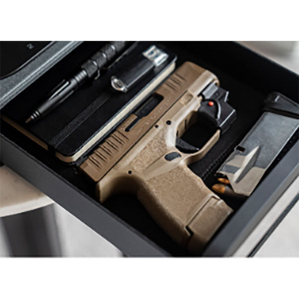La cassaforte DS2i SMART STATION di VAULTEK è l'ultima gamma di casseforti di precisione. Il DS2i si concentra sulla facilità d'uso e sulla sicurezza pratica. Grazie al design compatto, possono essere alloggiate pistole con una lunghezza totale fino a 19 cm. È possibile archiviare anche documenti aggiuntivi come passaporti, carte di credito o contanti. L'alloggiamento sagomato con precisione in robusto acciaio calibro 18 con la tecnologia di formatura progressiva dei metalli firmata VAULTEK garantisce la massima durata possibile. Grazie all'esclusiva tastiera retroilluminata a LED, puoi inserire il codice master per sbloccare anche in condizioni di scarsa visibilità e un'illuminazione interna a LED completamente nuova ne illumina il contenuto. Se l'alimentazione viene interrotta, il DS2i è dotato di una batteria di emergenza integrata. Il display della DS2i SMART STATION mostra l'ora, la temperatura e l'umidità. NON è una sveglia, perché hai il cellulare sopra e puoi usarlo come sveglia.