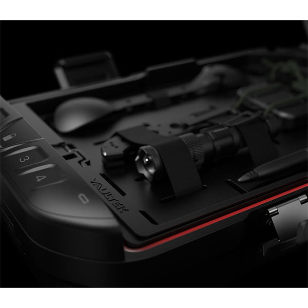 Grazie alla miscela di materiali brevettata da VAULTEK, LIFEPOD 2.0 è estremamente robusto, resistente agli urti e tuttavia leggero. La cassaforte è inoltre impermeabile, ermetica, resistente alla polvere e galleggia in acqua. L'alimentazione è fornita da una batteria alcalina da 9 V con una durata fino a un anno (batteria non inclusa).
