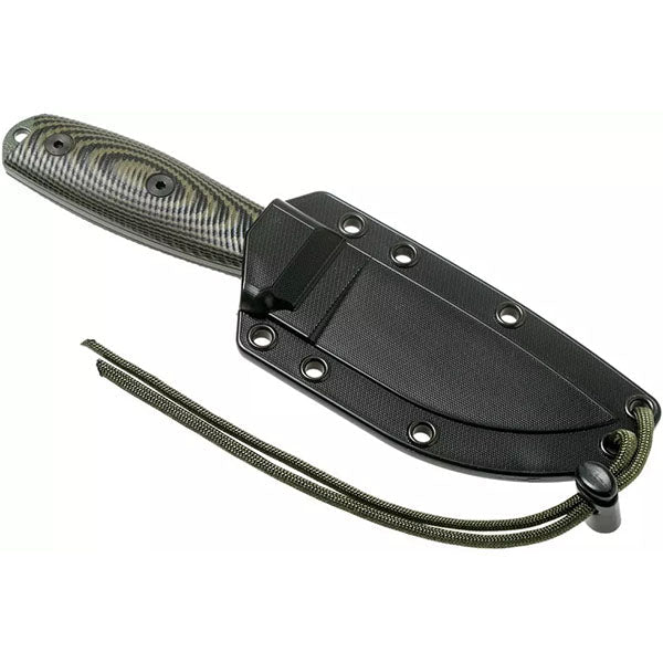 Der ergonomisch gestaltete Griff besteht aus strapazierfähigem und ergonomischem G-10. Er bietet eine sichere und bequeme Handhabung, selbst unter schwierigen Bedingungen. Das MODELL 3 Messer verfügt über einen Full-Tang-Aufbau, bei dem die Klinge vollständig durch den Griff verläuft. Dadurch wird eine maximale Stabilität und Haltbarkeit gewährleistet, was das Messer äußerst zuverlässig in verschiedenen Situationen macht. Zusätzlich ist das Modell 3 Messer mit praktischen Funktionen ausgestattet. Es verfügt über eine Öse am Griffende, die als Schlagfläche oder Befestigungspunkt dienen kann. Darüber hinaus enthält das Messer eine Fingermulde und Rillen auf der Oberseite der Klinge für verbesserte Kontrolle und Präzision. Zusammen mit dem Messer wird eine gut durchdachte und flexible Messerscheide geliefert. Das Messer sitzt perfekt in der schwarzen Zytelscheide, die nach Wunsch auf der mitgelieferten Platte mit Gürtelclip montiert werden kann.