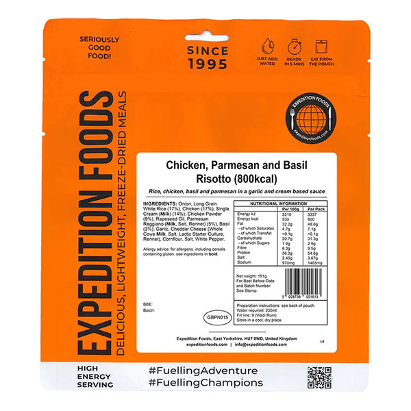 Möchtest du jemanden mit dem perfekten Outdoor-Mahlzeit beeindrucken? Das Chicken, Parmesan und Basilikum Risotto von EXPEDITION FOODS wird genau richtig sein. Mit Langkornreis, Poulet, Parmesan, Basilikum, Salz und Pfeffer ist diese Mahlzeit KÖSTLICH. Vergiss nicht die Flasche Wein dazu.