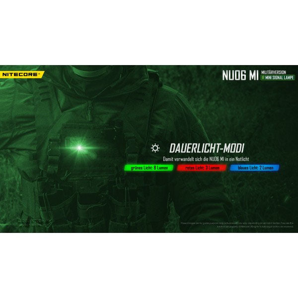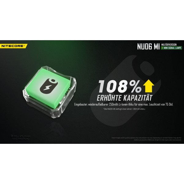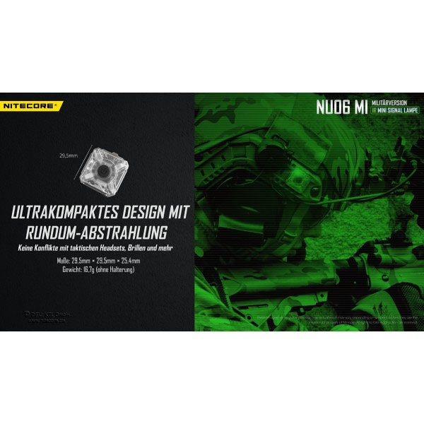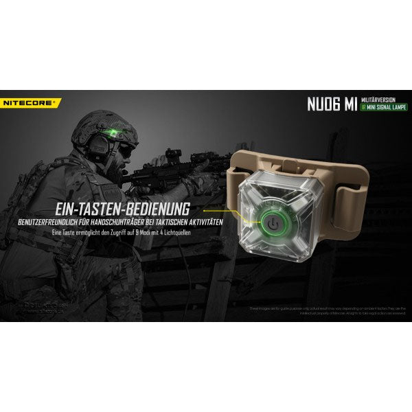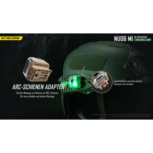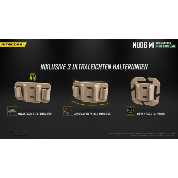 Die Nitecore NU06MI ist eine kleine und kompakte Signallampe, dessen eingebauter Li-Ion Akku über einen USB-C-Anschluss aufladbar ist. Die NU06MI wird mit drei Halterungen geliefert: Eine magnetische (mit Klett), eine gebogene für den Helm (mit Klett) sowie eine Aufnahme zum Befestigen am MOLLE-System. Die NU06MI ist mit einem Adapter für die ARC-Schiene ausgestattet und kann so ohne zusätzliche Halterung am Einsatzhelm befestigt werden. Die Nitecore NU06MI verfügt über 4 Lichtquellen, rot, grün, blau und IR. Jede einzelne Lichtquelle lässt als Blinklicht oder konstant leuchtend einschalten. Der eingeschaltete IR-Modus wir durch kurzzeitge Vibration des Gehäuses angezeigt.